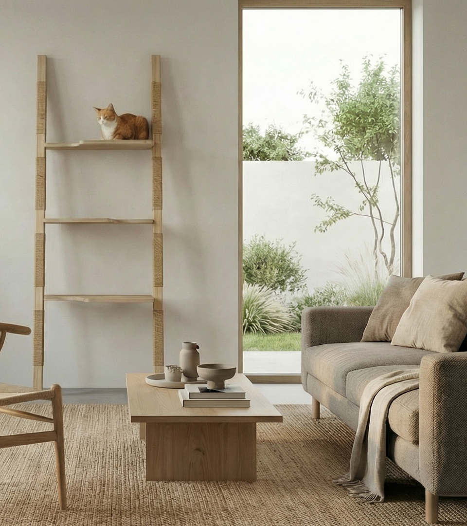 Wir gestalten Systeme – keine Möbelstücke – die beiden Welten gerecht werden: dem Bedürfnis der Katze nach Bewegung, Krallenpflege und Aussicht, und dem menschlichen Verlangen nach Ruhe, Schönheit und Ordnung im Raum.